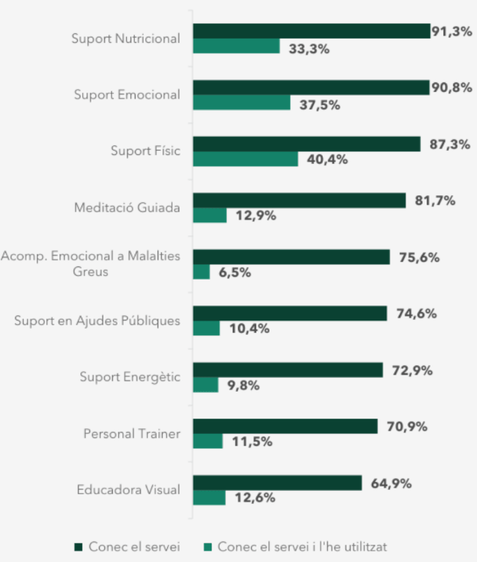 Els serveis que més han fet servir les persones entrevistades són els vinculats amb el suport físic, concretament un 40%, seguit dels de suport emocional amb un 37% i els de suport nutricional, amb un 33%. Com es pot veure al gràfic 1, la taxa de participació de cada servei varia entre el 7% i el