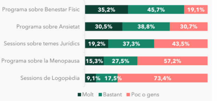 Les entrevistes han permès també conèixer quines son les principals inquietuds vinculades amb la salut de les persones treballadores. Hi ha tres serveis que clarament han estat destacats: benestar físic, ansietat i temes jurídics. Val a dir, però, que entre ells hi trobem diferències importants, ja que si bé un 80,9% estaria interessat en participar en el programa de benestar físic; aquesta xifra baixa fins al 69,3% en el d’ansietat, i fins el 56,3% en el de temes jurídics.