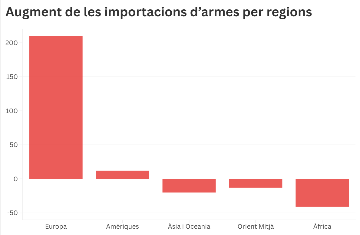 Europa ha passat a ser la regió que més armes importa del món, amb el 33% del total global. Les importacions dels estats europeus s’han triplicat (+210%) en comparació amb el període anterior.