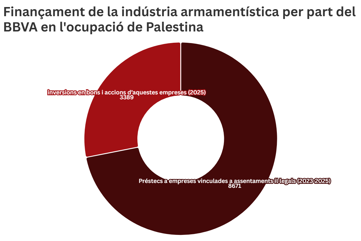 Segons una investigació recent citada per la campanya, el BBVA ha finançat empreses que operen en assentaments il·legals a Palestina amb 8.671 milions de dòlars entre 2023 i 2025. A més, durant el 2025 mantenia inversions en bons i accions d’aquestes empreses per valor de 3.389 milions de dòlars. En total, l’entitat hauria canalitzat més de 12.060 milions de dòlars cap a empreses vinculades a l’ocupació i el conflicte.