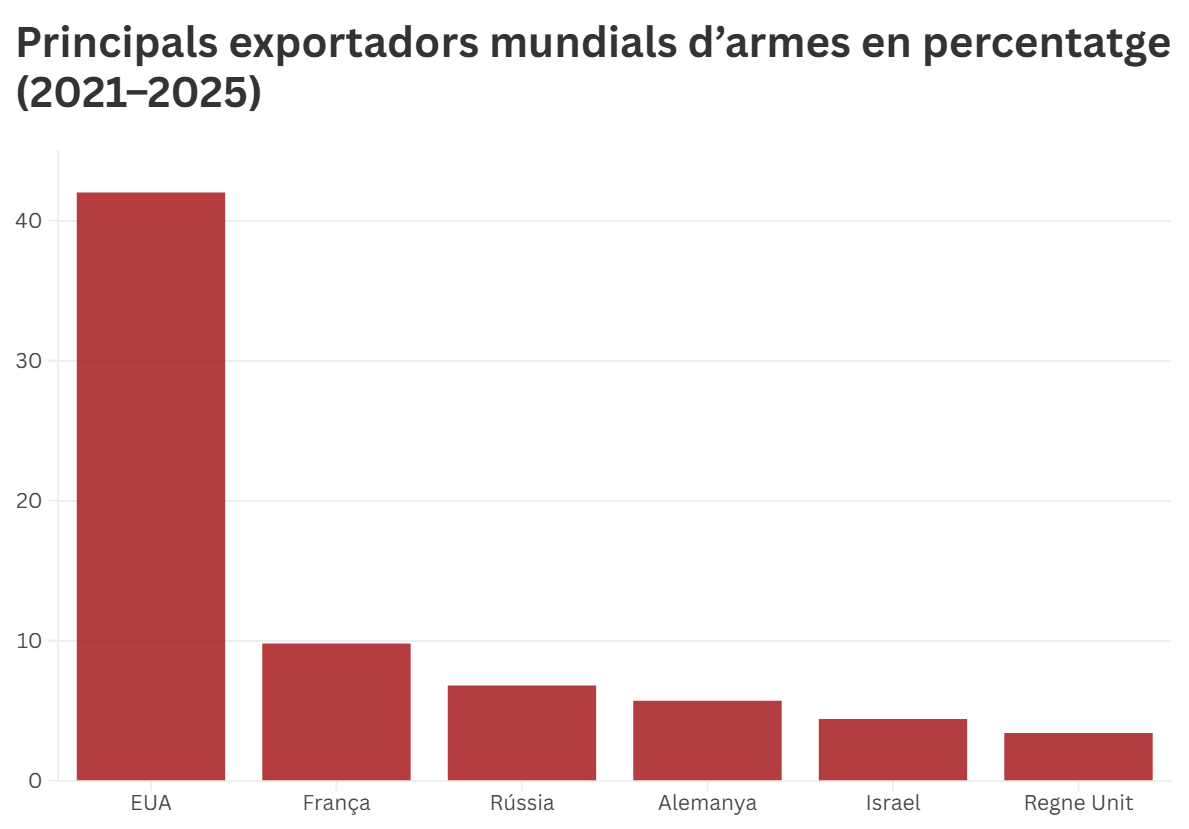 Els Estats Units continuen sent el principal proveïdor mundial d’armes, amb el 42% de totes les exportacions internacionals entre 2021 i 2025, davant del 36% del període anterior.