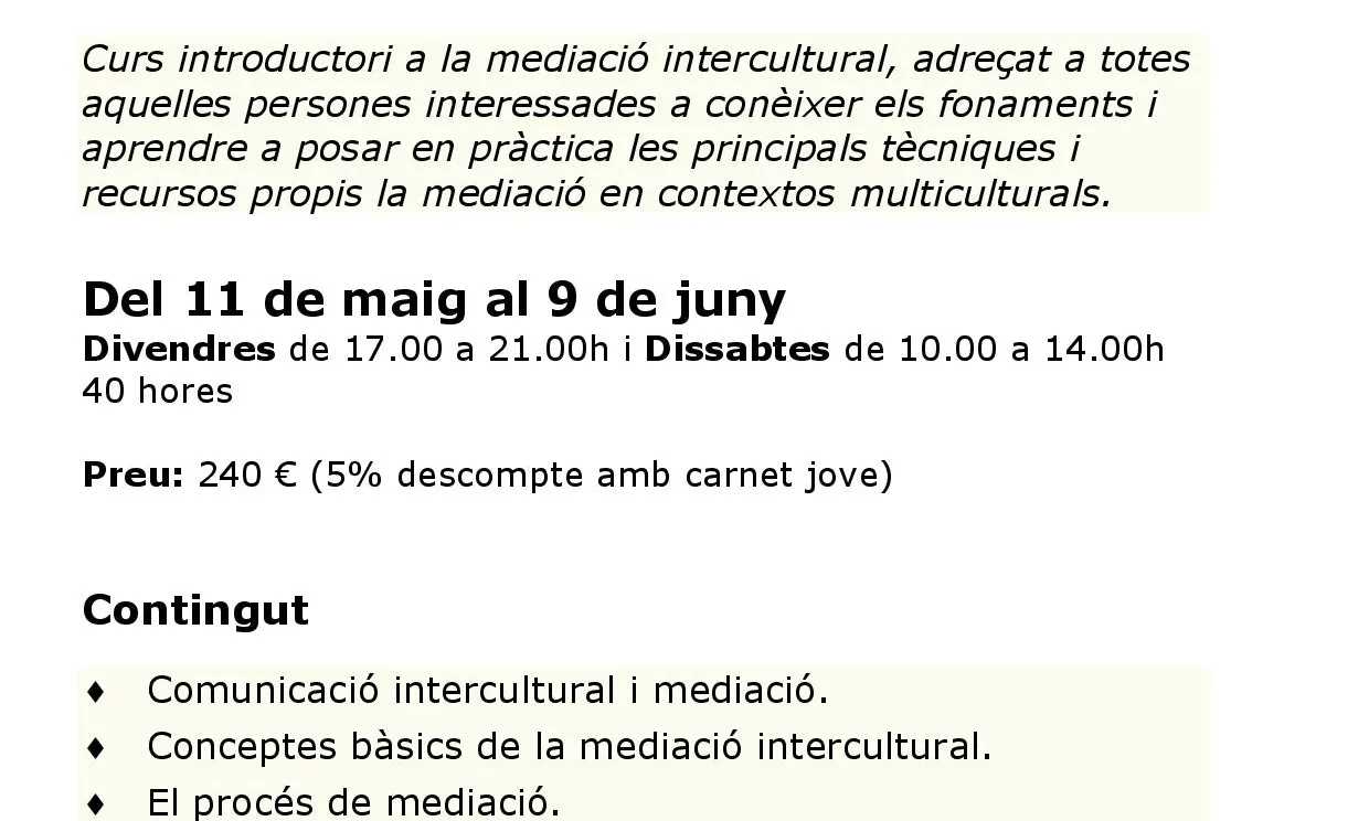 Aquest curs ofereix un espai per a tothom qui vulgui introduir-se en el món de la mediació intercultural i adquirir-ne competències. Vol donar a conèixer als participants el sentit de la relació i de la comunicació en general i la intercultural en particular tot donant eines, recursos i tècniques que els capacitin per a la mediació intercultural.